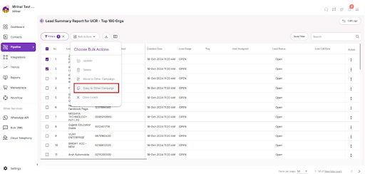 2. after selecting the leads to copy, Click on the bulk action button for any one of the campaign