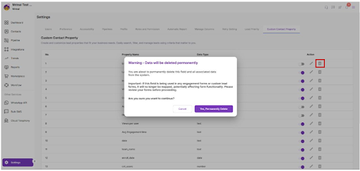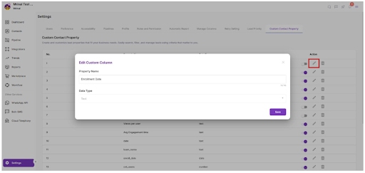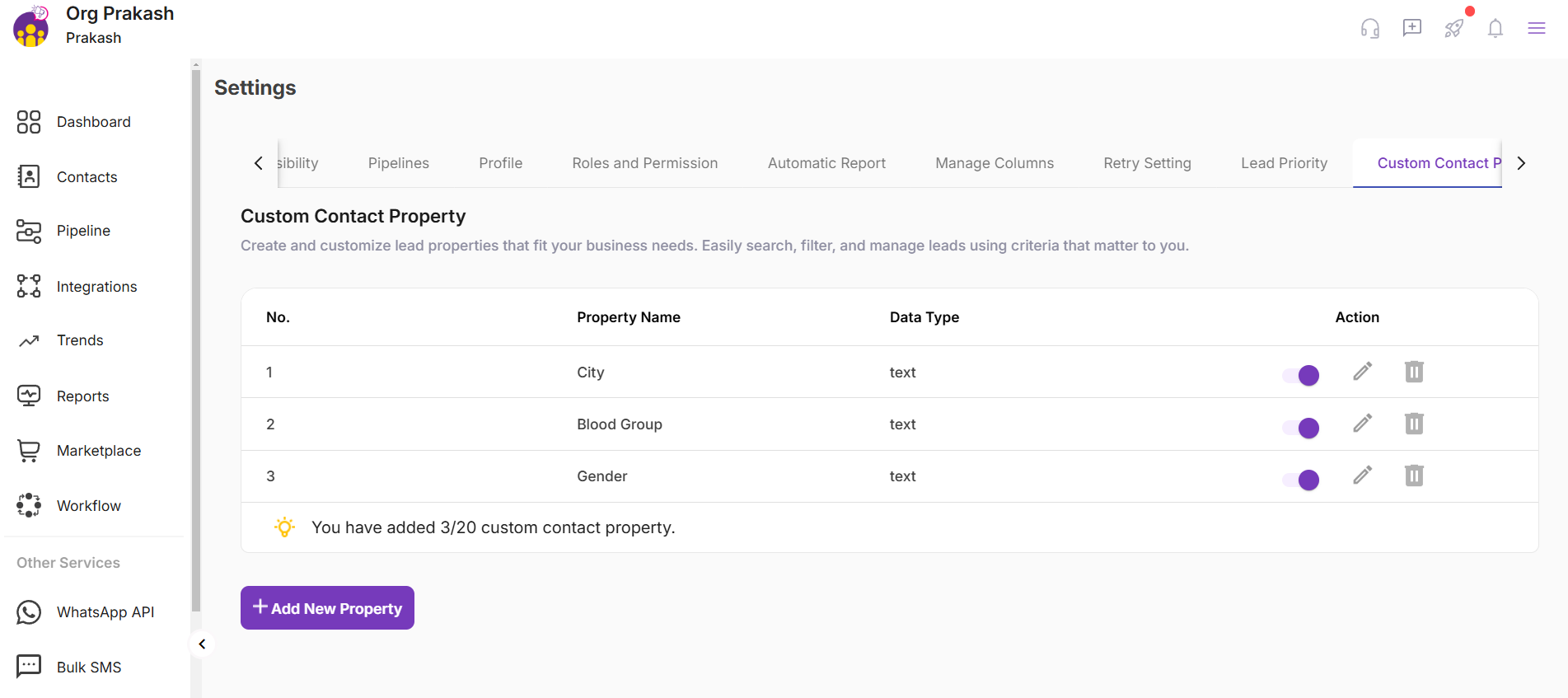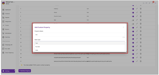 4. After clicking on Custom Contact Properties the following page will be shown. From here the user will be able to see the already created properties and can add new property as well.