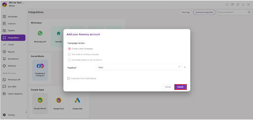 4. A menu bar will appear, select the **campaign** for which you want to integrate **Aisensy.**