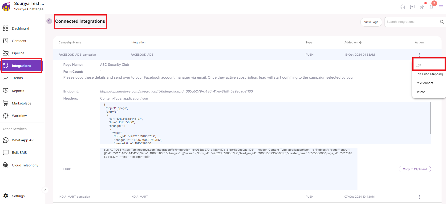 After the integration, click on the three dots “Action button” of the added Facebook Integration.