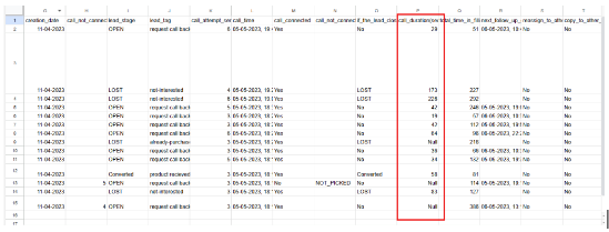 9. Now with this analysis, you will be able to see how many leads by any agents were disposed of without even attempting the call. If there is any count against any agent under the “Null” Column in your pivot table, then that would mean that the agent has disposed of these many leads without even attempting a call